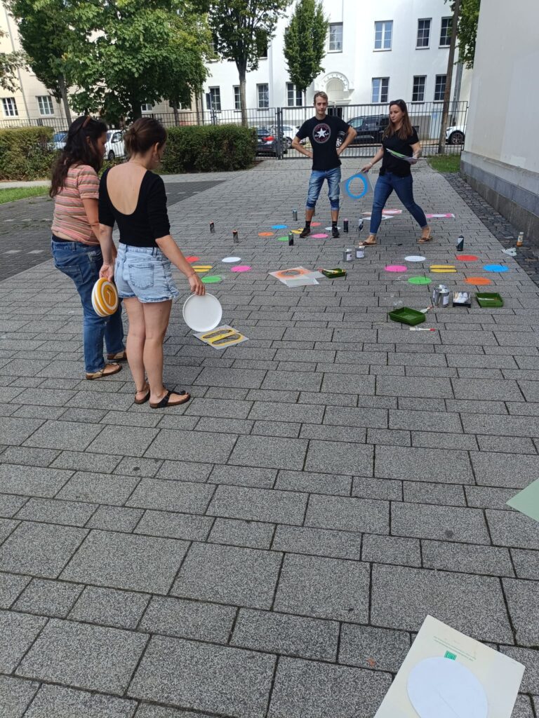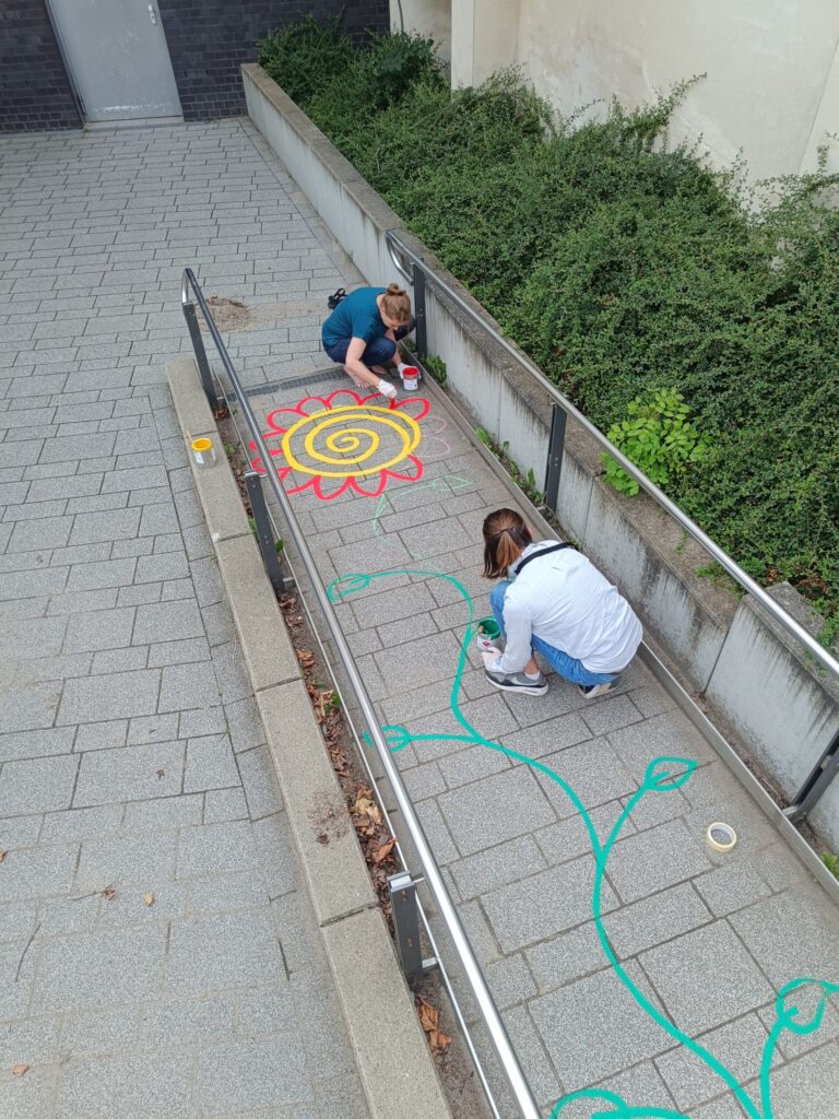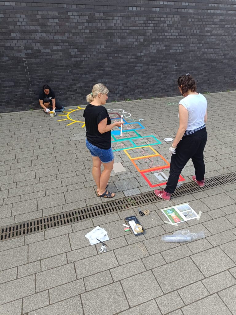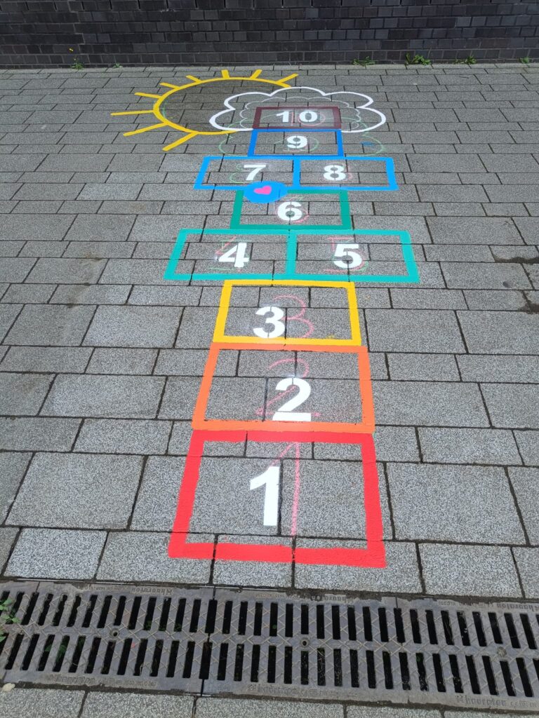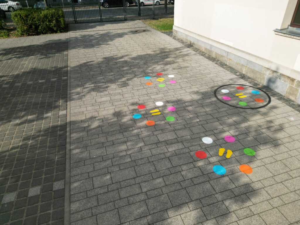 In der Vorbereitungswoche haben unsere Lehrerinnen und Lehrer nicht nur fleißig Unterricht geplant, sondern auch den Schulhof in ein kleines Spieleparadies verwandelt. Mit Kreide und Farbe sind viele bunte Bilder und Muster auf dem Boden entstanden.