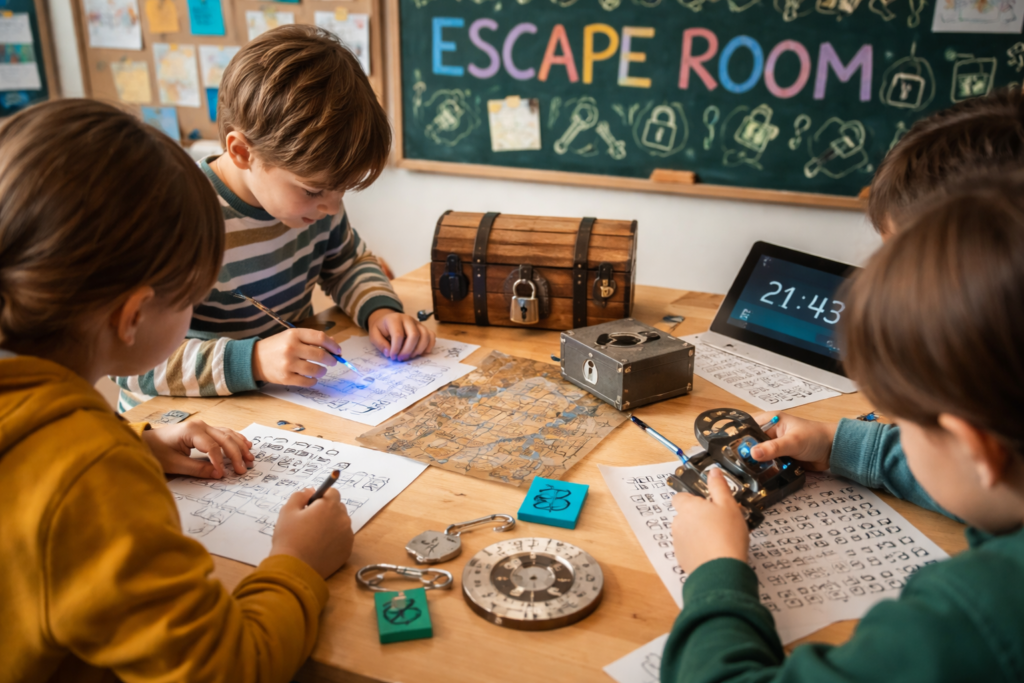 Schon kurz vor 17:00 Uhr öffneten sich die Türen und die Kinder fanden sich in ihren zuvor „erpuzzelten“ Teams zusammen. Als Abschluss des Fächerverbunds wartete ein Märchen-Escape-Room auf sie. Zwar konnte kein Team alle Rätsel vollständig lösen, doch die Gruppen Rotkäppchen, Dornröschen und Frau Holle kamen der Lösung sehr nahe. Besonders die Teams Rotkäppchen, Der Hase und der Igel sowie Rumpelstilzchen zeigten dabei beeindruckende Teamarbeit.